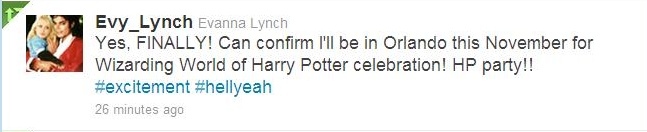 Pelo seu twitter, Evanna Lynch confirma que estará em Novembro no Mundo Mágico de Harry Potter em Orlando!